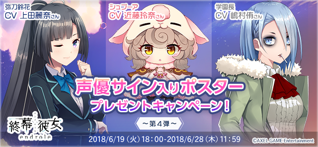 アクセルマーク株式会社(本社:東京都中野区 代表者:尾下 順治 証券コード:3624)の完全子会社であるアクセルゲームエンターテインメント株式会社は、開発中の新作タイトル『終幕彼女(エンドロール)』に新たに声優として上田麗奈さん、近藤玲奈さん、嶋村侑さんに参画頂くことが決定いたしました。参画にあたり、お三方からのメッセージを公開するとともに、お三方のサイン入りポスタープレゼント企画を本日より開始いたします。 ヒロインの一人で騎士道精神に富み、一直線なキャラクター「弥刀鈴花(みとすずか)」役を上田麗奈さんに、自称世界一かわいいナビキャラ「シュプーア」役を近藤玲奈さんに、元ヤン風やさぐれ指揮官「学園長」を嶋村侑さんに演じていただきます。なお、「シュプーア」および「学園長」は、新キャラクターとして公式サイトで情報を公開いたしました。 さらに『終幕彼女(エンドロール)』ではYoutube公式チャンネルを開設しました。 本チャンネルでは、5人の終幕彼女(エンドロール)たちの様々なセリフが聞けるサンプルボイスを公開しています。 同時にAnimeJapan2018で公開した「心音優愛」役の千本木彩花さんのキャストインタビュー動画を配信開始いたしました。是非ご視聴ください。 【Youtube公式チャンネル】https://www.youtube.com/channel/UCfz0QrKzEjhYxEZup7Awj_A ○キャラクターを演じる3人からのメッセージ <上田麗奈さん(弥刀鈴花 役)> 【弥刀 鈴花(みと すずか)】 ・出身ゲーム:スマッシュ・ラッシュ・ハイスクール(対戦格闘ゲーム) ・風紀を守る堅物剣士。 騎士道精神に富んでいて、潔い。 決めたことを実行する力があり、こうと決めたら一直線だが そのぶん時々周囲が見えなくなり、やりすぎてしまうことがある。 ▼上田麗奈さんコメント 真面目で正義感が強くて一直線。 その分周りが見えなくなってしまうところもあったり、実は重度のむっつりスケべだったり…、 一見とっつきにくそうですが、ギャップの激しいとっても可愛い人なので、 作品共々、鈴花さんのことも愛して頂けますと幸いです。 何卒、よろしくお願い致します。 <近藤玲奈さん(シュプーア 役)> 【シュプーア】 ・出身ゲーム:??? ・自称・世界一かわいいナビキャラ。 自分がソシャゲ界一かわいいナビゲートキャラだと信じて疑わない。 自分のことを「しゅぷー」と呼ぶ。 学園長の助手であり、終幕彼女システムの深い部分についての知識も共有している。 ▼近藤玲奈さんコメント シュプーアちゃんはお調子者で少し高飛車なところもありますが、 そこが愛すべきポイントでもあるマスコットキャラだなぁと思いました。 いつも全力で、一生懸命なシュプーアちゃんをよろしくお願いします! みなさんの力で、ゲーム世界の女の子たちを救ってあげてください! <嶋村侑さん(学園長 役)> 【学園長】 ・元ヤン風やさぐれ指揮官。 普段表情をほとんど変えることがなく、常に飄々としている。 けだるげで言葉遣いもぶっきらぼうだが、姉御肌なので生徒からの人望はある。 ▼嶋村侑さんコメント 学園長を初めて見た時の印象は、 「これはアイメイクがグリグリなのか顔色が悪いのか、なかなか気怠いな」でした。 蓋をあけたら、内面は実は結構温かそうです。 彼女はナビゲーター的立ち位置ですが、お話がとっても練られているので、お楽しみに。 終幕彼女、ぜひ遊んでみて下さいね! ○『終幕彼女』ヒロイン声優3名のサイン入りA3クリアポスタープレゼント! 応募期間:2018年6月19日(火)18:00~2018年6月28日(木)11:59まで 『終幕彼女』に登場するゲームヒロイン「弥刀鈴花」、サブキャラクター「シュプーア」「学園長」の出演声優決定を記念して、上田麗奈さん、近藤玲奈さん、嶋村侑さん、それぞれのサインが入ったA3クリアポスターを抽選で1名様にプレゼントいたします。 公式Twitter:https://twitter.com/endrole_endol ※詳細は公式Twitterをご覧ください。また本キャンペーン内容は予告なく変更となる場合がございますので、ご了承ください。 ○『終幕彼女(エンドロール)』Youtube公式チャンネル開設! 『終幕彼女(エンドロール)』Youtube公式チャンネルを開設いたしました。 公式チャンネルでは、5人の終幕彼女(エンドロール)のサンプルボイスを公開中! 併せてAnimeJapan2018で公開した、千本木彩花さん(心音優愛 役)のインタビュー動画を配信しています。 【公式チャンネル】https://www.youtube.com/channel/UCfz0QrKzEjhYxEZup7Awj_A ▼主要ゲームヒロイン5人のサンプルボイス公開! 『終幕彼女(エンドロール)』では、「心音優愛(CV:千本木彩花」、「早川咲(CV:神梛めい)」、「織田雛乃(CV:日高里菜)」、「ヴェルヴェット=スピーカー(CV:瀬戸麻沙美)」、「ルノア=M=ドライエール(CV:小倉唯)」5人のサンプルボイスを『終幕彼女(エンドロール)』Youtube公式チャンネルで公開中! 終幕彼女(エンドロール)たちの、生き生きとしたセリフを聞くことができます。 ▼【キャストインタビュー 千本木彩花さん(心音優愛 役)】 AnimeJapan2018で公開した、ゲームヒロインの1人「