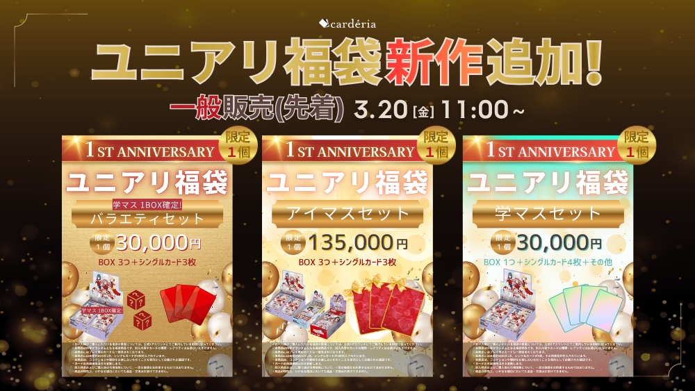 アクセルマーク株式会社(本社:東京都中野区、代表取締役社長:松川裕史、証券コード:3624)が運営するトレーディングカード専門店「cardéria™(カーデリア)池袋店」は、抽選販売で高い反響があった1周年記念福袋について、数量限定で一般販売(先着)を2026年3月20日より実施するとともに、新たにユニオンアリーナの新作福袋を同日より展開いたします。